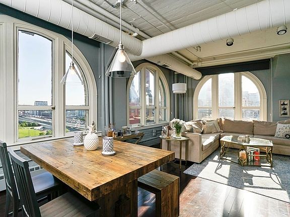 LEATHER DISTRICT LOFT! Two-bedroom/two-bath corner penthouse with dynamic city and skyline views and beautiful sunsets in a full-service building. This expansive home features walls of architectural arched windows, high-end appliances, including an in-unit washer and dryer, wood floors and a sun-splashed open floor plan perfect for entertaining and the sophisticated urban lifestyle! This professionally - managed building has a well-equipped fitness room, bike room, huge extra storage units, a concierge and is located one block from South Station. Other area amenities include N.E. Medical Center, theater district, restaurants and shopping, the Greenway as well as the Channel/Seaport District and easy access to the high ways and Mass Pike. Pet friendly!