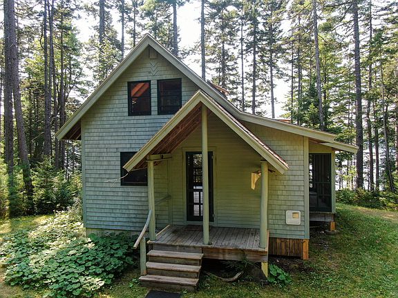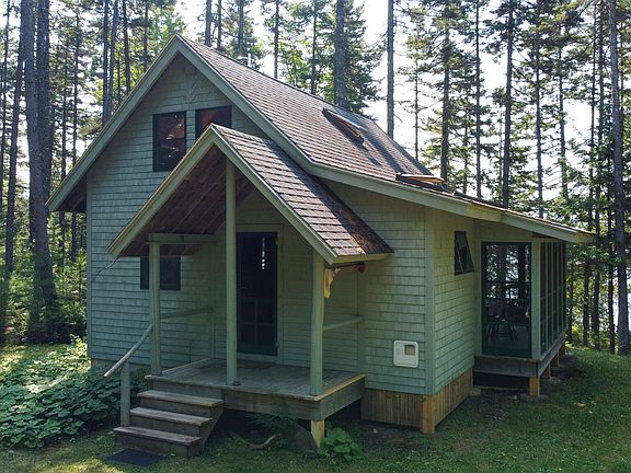 This cottage is a labor of love, with a significant portion of its lumber sourced from trees on the owner's land in Wells, Maine. It's a testament to sustainability and the pride of cabin ownership. From the built in bookshelves, daybed storage, lakeside windows to the screened in porch, the design was well thought out.