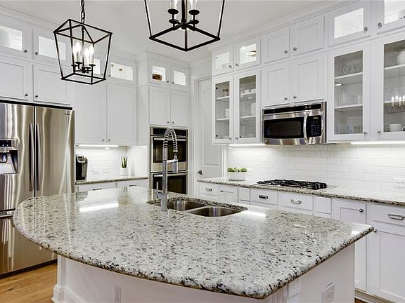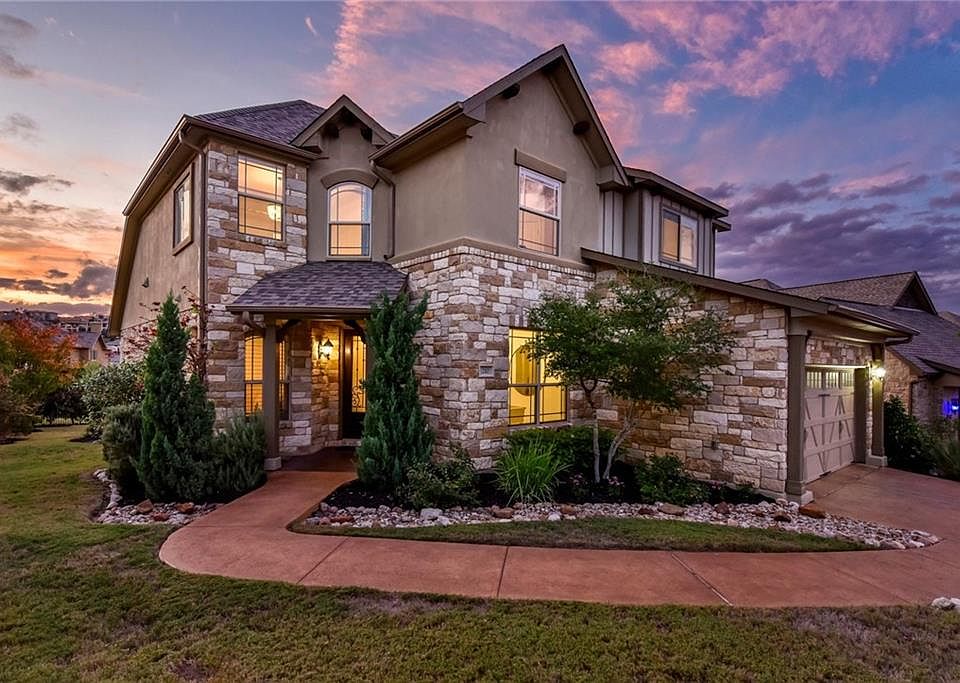 Extensively upgraded in 2017 to the modern farmhouse design, this light and bright floor plan is a must see!!! Enjoy the sunset from the covered patio with deluxe outdoor kitchen overlooking the large, level backyard with sweeping hill country views. The cook in the family will appreciate the open kitchen with custom cabinetry, large island, double ovens, gas cooktop, and walk-in pantry. Great room has soaring ceiling and custom gas log fireplace with Carrara marble facing. Large main level master suite offers Whirlpool soaker tub, separate shower and large walk-in closet. The main level also includes a separate study and formal dining. Upstairs media room is wired for surround sound, three bedrooms and two upgraded bathrooms complete the second level. Wide plank, white oak wood flooring and plantation shutters throughout the main level, and premium carpet and blackout shades throughout the second level. Walk to the wonderful Rough Hollow Community Amenities.