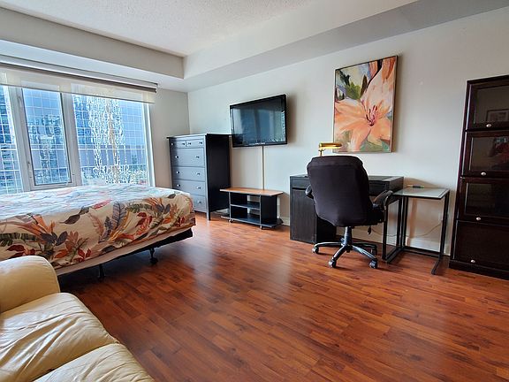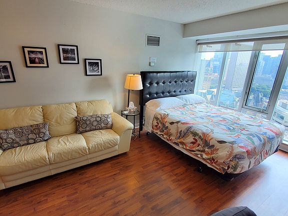 Fully furnished, all utilities included! Move in with your suitcases. Best central downtown location across from Eaton Centre, steps to subway and Dundas Square, Ryerson, and walking distance to all amenities. Available from January 1, 2025, either for a 4-month term or longer. Earlier move-in before new year is possible - please inquire. Virtual tour and/or videos are available. On higher level with open view to the southwest. Secure building with 24 hr concierge, plus a full service restaurant and bar on the ground level. All utilities included. 4 months minimum rental period.