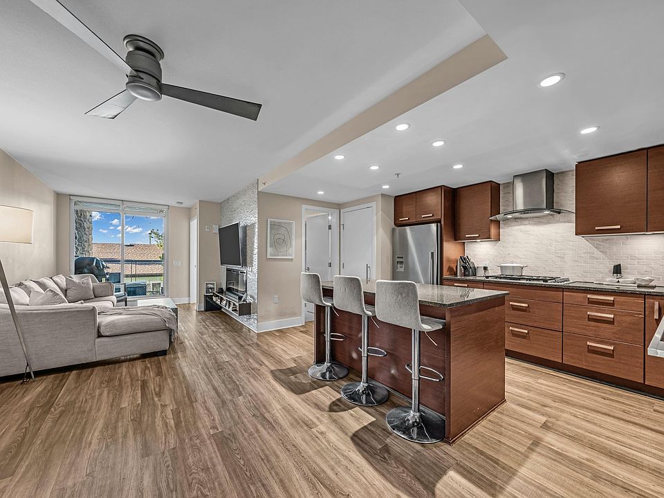 Welcome to The Kimpton, a 5-story CONCRETE, LEED-standard executive residence in the heart of Central Lonsdale. This 1 bed 1 bath home boasts a spacious open-concept layout, in-floor radiant heating included in your maintenance fees & a large bedroom with a walk-in closet. Located on the 3rd floor, this suite offers a quiet & stunning appeal. The gourmet kitchen features granite countertops, premium Fisher & Paykel stainless steel appliances, dishwasher, & gourmet gas cooktop. Additional highlights include a full-sized washer & dryer, a travertine stone feature wall with a cozy fireplace & a covered private BALCONY. A near perfect walk score steps to shops, gyms, restaurants, local grocers, banks, transit, schools, Waterfront & more. 1 PARKING 1 LOCKER. Book your private showing today.