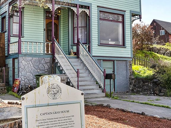Character abounds this Queen Ann Victorian in Downtown! Opportunities!! Zoning allows res & com use! Captain Grays House would make a great bed & breakfast. Great location in the heart of TD HW flrs on main w/high ceilings & original vintage charm! Living, dining, & family rm on main w/ big kitchen & pantry! Sun room & bedroom on the main! Original stained glass. Gorgeous banister. 2.5 flrs ladder to additional bed & bath! Original clawfoot! Plenty of storage! Balcony w/views. Many features!