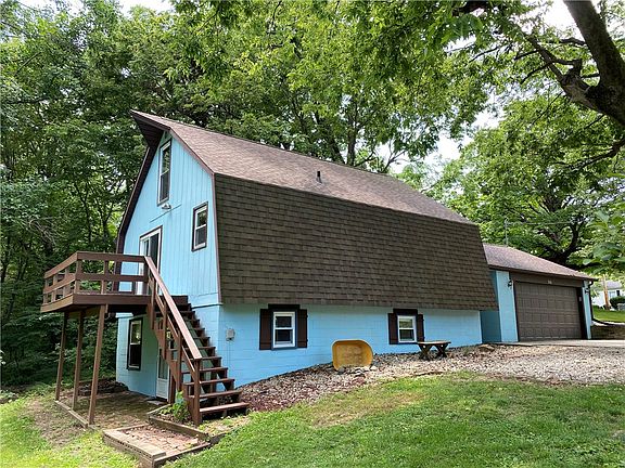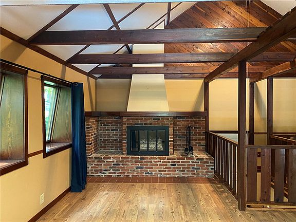 LET YOUR WILD SIDE SHINE in this charming barn style home tucked in a wooded setting. The space maximizes every inch with an open concept living room, dining room and kitchen while exposed ceiling beams and a multi-purpose loft make this home totally trendy. A massive brick fireplace and wood floors radiate coziness in the inviting living room. A deck off the dining area overlooks the rustic yard and shades a charming brick patio. Fashionable and flexible, the spacious loft is a great place to kick back and relax or can accommodate overnight guests. Three bedrooms and a combination laundry/full bath combination are located on the lower level. The attached two-car garage has plenty space for additional storage and hard-working workshop space. Store garden tools, off-duty muck boots and those shrubs/flowers waiting to be planted in the garden shed (former tree house). Not your run of the mill ranch, this may be the home you have been waiting for! (Radon mitigation system fan is on order.) Roof ~ 2015; owner has used fireplace.