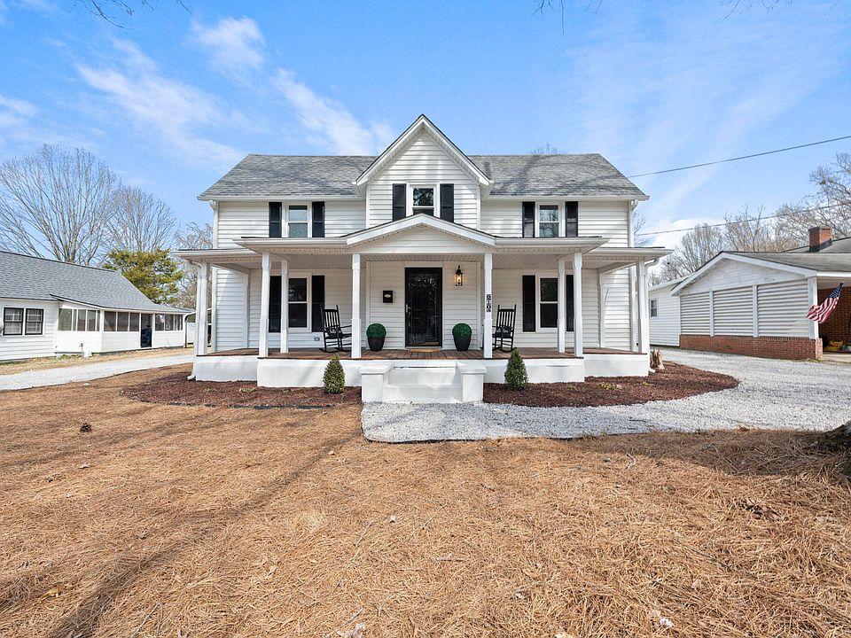 Seller Says Sell! Step into your future at historic 210 W Oak Ave. Thoughtful and beautiful renovation in this 1909 gem where historic charm meets modern living. Located just a short stroll from Wake Forest's Historic District, this home offers the perfect blend of character and convenience for discerning buyers. Begin your mornings on the expansive rocking chair front porch, sipping coffee and enjoying the serene surroundings. Inside, admire the stunning refinished hardwood floors that preserve the home's rich history. The bright and inviting living room, featuring a decorative fireplace, provides a warm and welcoming atmosphere. Entertain effortlessly in the spacious dining area that seamlessly flows into an updated kitchen, equipped with new granite countertops, a custom backsplash, and stainless steel appliances. The new rear deck enhances your living space, ideal for outdoor dining and relaxation. Retreat to the stylishly updated bathrooms, showcasing custom tile work and new vanities. The main-level bedroom offers added convenience, while upstairs, two additional bedrooms and a beautifully updated bath cater to various needs. A versatile flex space is perfect for a home office or activity center. This move-in-ready home features NEW INTERIOR PLUMBING & WATER HEATER , fresh paint, and new carpeting throughout. The fresh gravel driveway and large exterior shed add practicality and charm. Enjoy proximity to downtown Wake Forest and the beloved Joyner Park, providing tranquility with easy access to amenities. Don't miss out on owning a piece of Wake Forest's history—a home that artfully combines classic elegance and modern comfort. This is the perfect opportunity for you...Let's Make a Deal!!