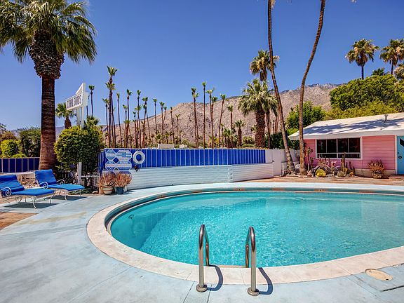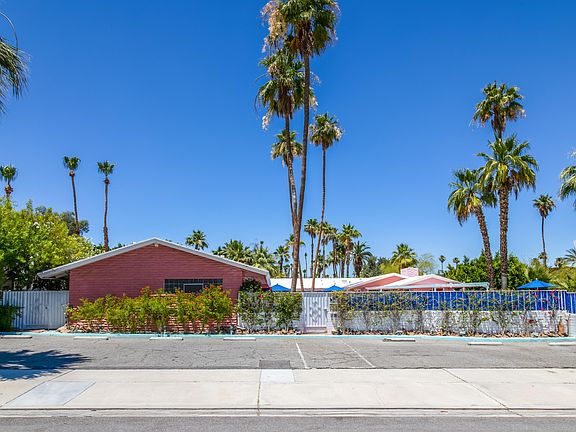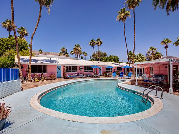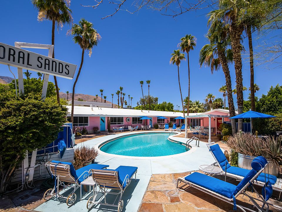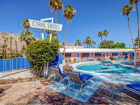Located in prestigious Little Tuscany and one block west of Palm Canyon Drive, Ruby Montana's Coral Sands Inn was built in 1952 for the Los Angeles Rams. Offering iconic mid-century architecture including vaulted wood beam ceilings and mid-century tile accents, this 4 unit property totals 7 bedrooms, 7 bathrooms including a 1,307 square foot 1 bed, 2 bath owner's unit plus three additional 739 square foot 2 bed, 2 bath guest units that overlook the refreshing pool. Each of the three guest units (A, B and C) are 739 square feet and have been divided into two individual rooms: one ''Suite'' includes a kitchen, bathroom and living/sleeping area while the other ''Room'' includes a kitchenette, bathroom and sleeping area. They have been appropriately named Unit A: The Yipee Ki Yo Ki Yay Let'er Buck Rodeo Suite and The Yiddish Cowgirl Room; Unit B: The Roy Rogers and Dale Evans Suite and The They Run With Poodles Don't They Room; and Unit C: The Liberace Suite and The Howdy Doody Goes to Bali Room. Unit D: The Owner's Suite includes a kitchen, living room with vaulted beam ceilings and fireplace, one bedroom, two baths, a private patio and bonus room.