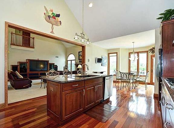 PRISTINE CUSTOM BRICK 2 STY W/GOLF COURSE VIEW FROM DECK. OPEN FLOOR PLAN TO UPPER LVL,FMLYRM W F/P,BRAZILIAN CHERRY FLRS IN FAMILYRM,DINING,KIT, & ENTRY,CHERRY PANELED OFFICE, EAT,-IN KIT,STAINLESS APPLS,ISLAND SEPARATION BETWEEN KIT&FMLYRM. MAIN FLOOR OWNERS SUITE WITH 2/MSTR CLOSETS,PRIVATE BATH W/RADIANT HEATED FLRS-2FLR 3BRMS,BATH. LOWER LVL 120' THEATRE RM W/STONE FP,2ND FULL KIT,THERMO SPA HOTTUB RM,5TH BEDRM,2ND MASTER SUITE W/FULL BA, RADIANT HEAT LWER LVL HUGE AREA FOR PLAY RM/STORAGE,PATIO/DECK