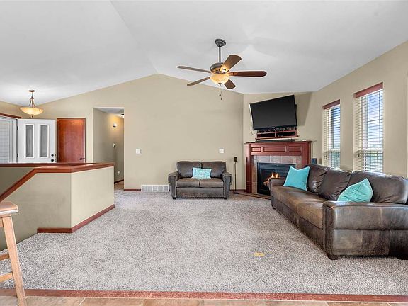 As you step through the front door, you're greeted by cheerful stained woodwork The tiled entrance leads to a coat closet and straight ahead,expansive windows fill the space with abundant natural light Vaulted ceilings add to the home's charm, while above the fireplace, built-in shelving and a TV unit createa cozy focal point To the left a hallway leads to a bathroom with a tub and shower Nearby a convenient closet houses the washer and dryer opposite the first bedroomEach bedroom features matching wooden blinds and double closets At the end of the hallway bedroom #2 serves as a gaming room and office boasting a double closetand window The master bedroom awaits with vaulted ceilings and an attached suite complete with smart lights The kitchen showcases a raised breakfast bar andcherry cabinets complementing the home's woodwork Black appliances including a gas stove grace the space while stylish windows above the cabinets invite amplenatural light The basement is approx. 1000
