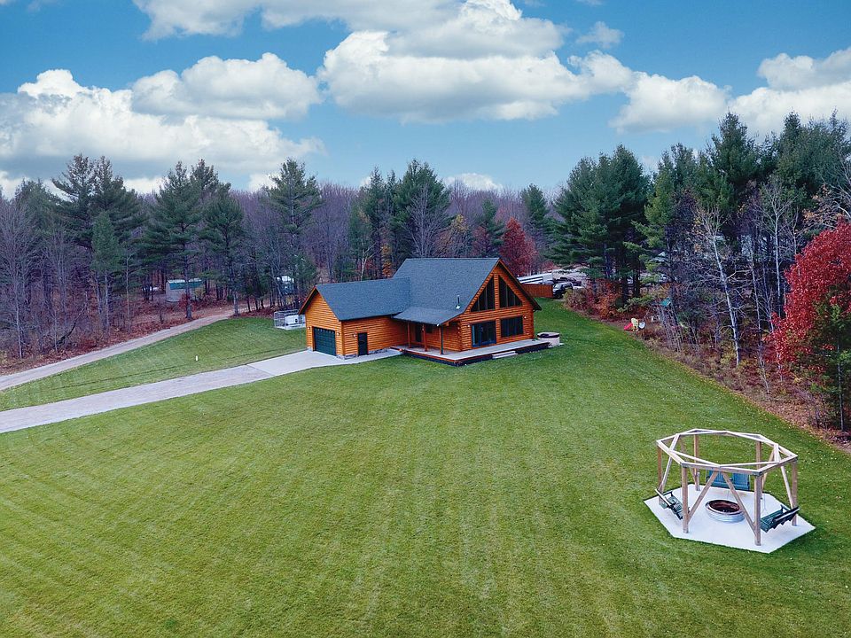 This 3bdr, 2 bath custom built 8'' full ''D'' log home has ample space for living and entertaining, while the lovely natural lighting accents the cathedral ceilings. Home features heated floors, cozy pellet stove, spacious master ensuite, lower level that is plumbed for 3rd bath, attached 2 plus garage, meticulously landscaped, covered patio, and all privately situated on almost 5 acres! 40'x64'x16' fully finished, insulated and heated shop with enough lighting to get a tan! 12'x12' lean to's run the entire length on both sides of building. 2-12'x14' overhead doors with silent openers. Partitioned man cave with Satellite TV and overhead loft. A remarkable building with nothing spared. You will not find another like this one! A gear heads dream!