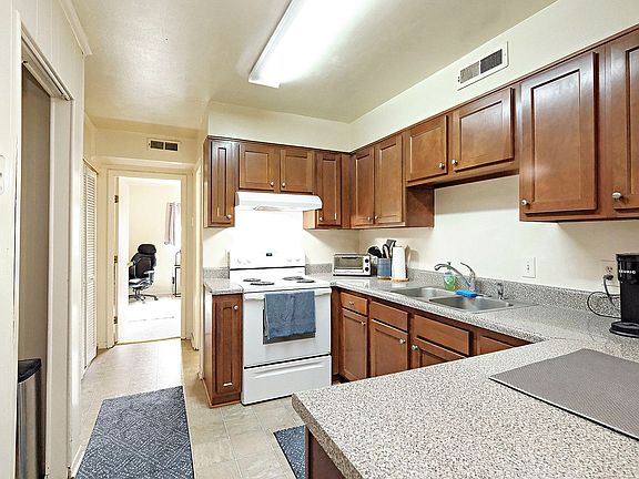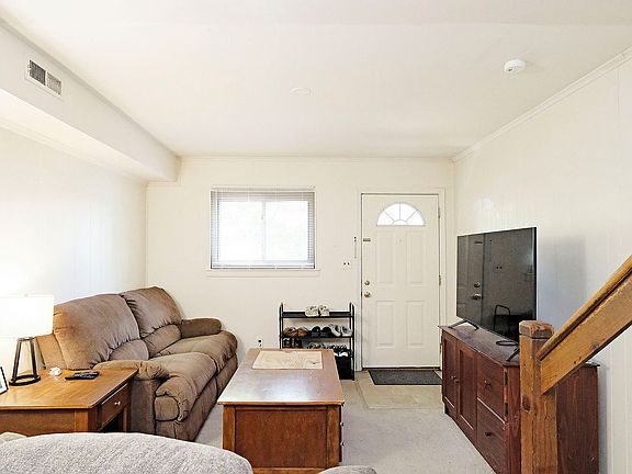 Inside the 908 sqft two-level condo, you'll find a carpeted living room that flows into a kitchen with a full-size refrigerator, oven, and dishwasher. The main level also includes a bedroom and a full bathroom. Upstairs offers a spacious bedroom, a full hallway bath, and a third bedroom with a convenient stackable washer and dryer unit.