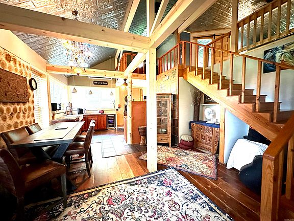 Hobby Farm with a Custom-built, Cedar Cordwood home, on 10 acres m/l of beautiful Ozark Mountain land, located near Mountain View, The Ozark Folk Center, and the White River. This artistic home is a must see, starting with its 15” thick walls, amazing 12” wide pine wooden floors, a new wood stove hearth with triple wall chimney, new mini split system. Upgraded amenities include a new dishwasher, a new garbage disposal, and propane heaters. Several wonderful features include a large clawfoot soakers tub, farm style kitchen sink, tin stamped ceiling, artistic mosaic tile walls, two loft areas for enjoyment, along with three bedrooms, truly a place for everyone! Another amazing feature of this property is its 25’ x 40’ steel shop, complete with an oversized garage door and a thick concrete floor. Property around house has been completely re-fenced; this includes five metal access gates. Beautiful grass pasture out front with acres of woods to enjoy, access trails, and beautiful large stone bluffs at the back of the property. Would be great for a Hunter with plenty of wildlife like white tail deer, turkey