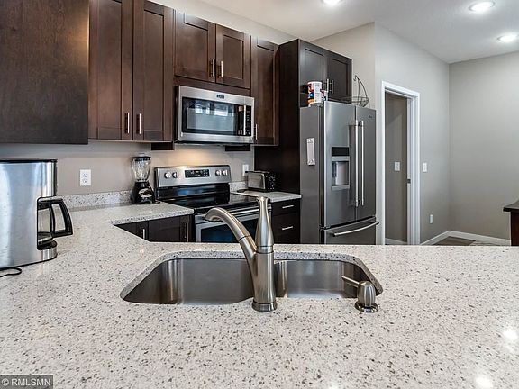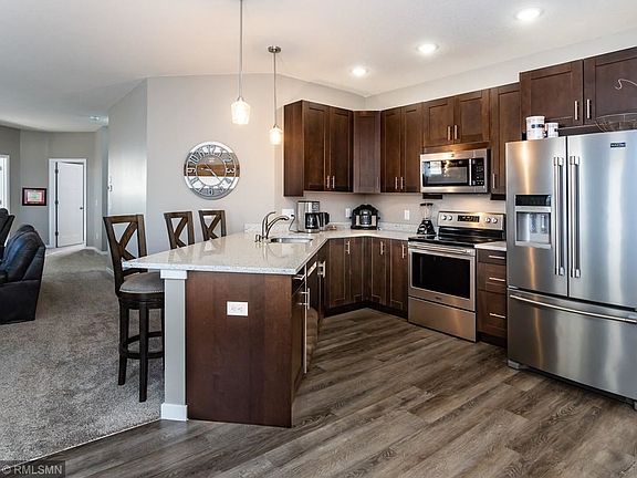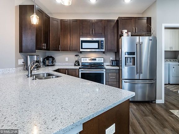 Meticulously maintained, looks and feels brand new with an open and inviting floor plan. True single level living featuring 2 beds plus sunroom/office, 2 bathrooms and 3 car garage. Gorgeous quartz countertops in kitchen, SS appliances, 9âEUR(tm) ceilings throughout and large windows providing endless natural light. Custom blinds throughout, garage door openers, irrigation system, water softener, and professional landscaping (rock & edging around, boulder walls, trees & shrubs). Welcome home!