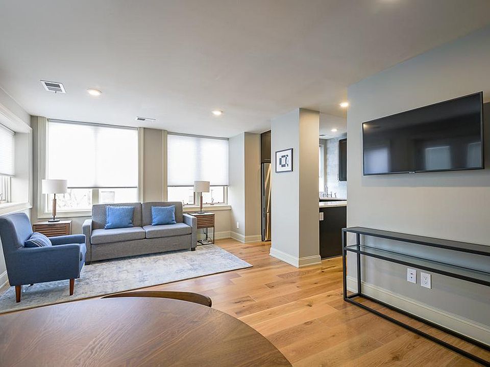 This Dupont Circle 1-bedroom, 1-bathroom condo is located on the top floor of the building, offering large windows and hardwood floors throughout. It features all brand-new furniture and fixtures, including a custom kitchen with new stainless steel appliances such as an oven, cooktop, and dishwasher, along with granite countertops. The open dining and living room includes a new couch, HDTV, wood-burning fireplace, new queen-size bed, and central air, providing a welcoming space to feel at home. The condo boasts a custom kitchen with new stainless steel appliances, including an oven, cooktop, and dishwasher, complemented by granite countertops. The open dining and living room area is furnished with a new couch, HDTV, and a wood-burning fireplace, creating a cozy atmosphere. Located in the heart of Dupont Circle, this condo is within a couple of blocks of shopping, groceries, restaurants, and transportation. Dupont Circle is a vibrant neighborhood and historic district in Northwest Washington, D.C., known for its bustling traffic circle at the intersection of Massachusetts Avenue NW, Connecticut Avenue NW, New Hampshire Avenue NW, P Street NW, and 19th Street NW. The neighborhood is approximately bounded by 15th Street NW to the east, 22nd Street NW to the west, M Street NW to the south, and Florida Avenue NW to the north.