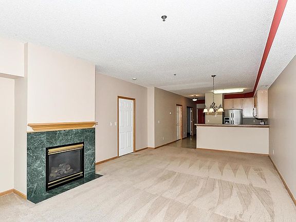 Bright and open townhome has so much to offer! Nice living spaces, gas fireplace, breakfast bar and room to gather with family and friends! Kitchen with new refrigerator, appliances included. Owners suite features a walk in closet and Private full bath. The added room is perfect for office, hobbies, guest room depending on your needs! Good storage! Second ¾ guest bath. Recently painted and carpets cleaned. One level. Elevator. Heated parking. Close to trails, shops, restaurants and more!