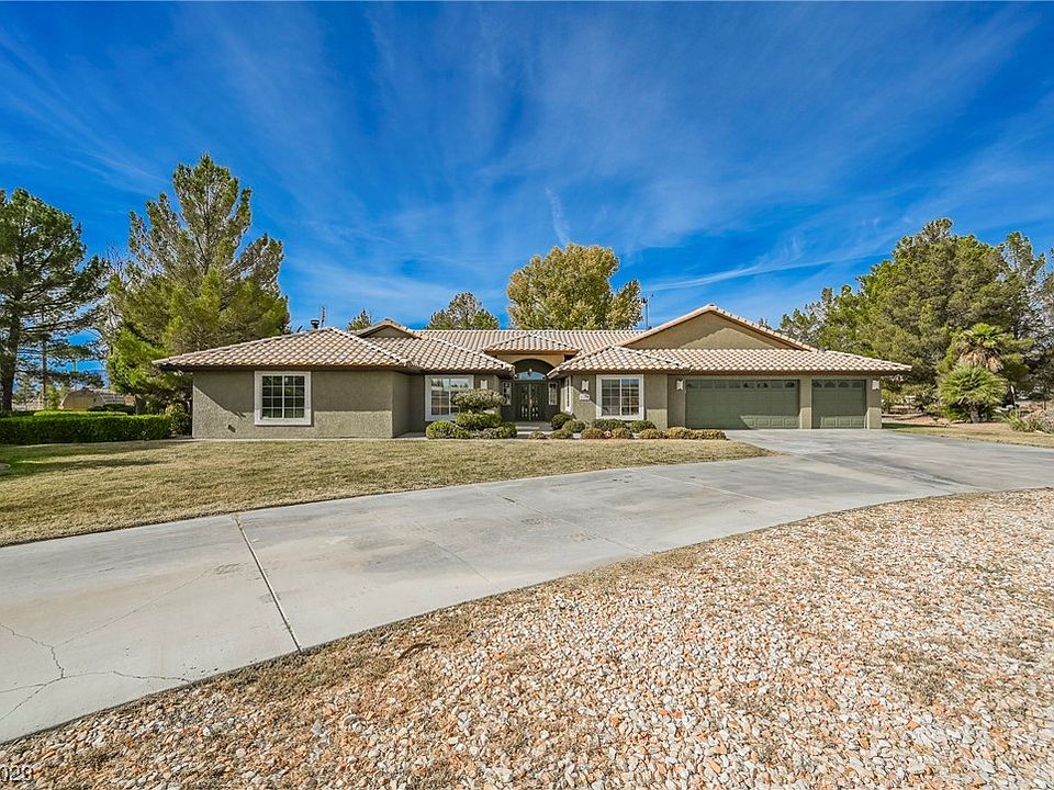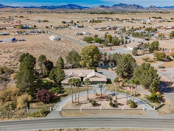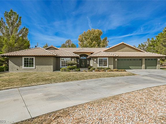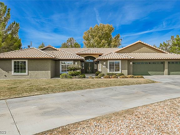 Welcome to this stunning single-story 3-car garage home with a circular driveway nestled on over an acre homesite in the charming town of Pahrump. Meticulously maintained mature landscaping. Open floor plan seamlessly connects family, dining and kitchen area. New flooring throughout and paint with neutral color pallet giving modern feel. Kitchen is a chef's dream featuring new stainless steel appliances, custom cabinets, quartz countertops and more. Step outside and you'll discover your very own private oasis. Enclosed covered patio, custom gazebo and multiple sheds. Don't miss the opportunity to make this beautiful home your own. Schedule tour today!!