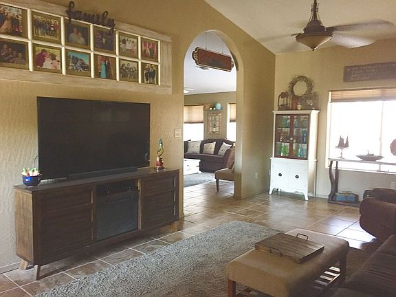 This home features 3 large bedrooms with big closets, 2 full bathrooms with tub and shower in each, tiled living room, dining room, and family room. The house has vaulted ceilings, plant niches, custom tile and paint. The newly remodeled kitchen includes granite counters, stainless appliances, deep stainless sink and new faucet. Extra large driveway can accomodate up to 4 cars side by side, as well as a second driveway for additional parking, boat or RV. Large RV area in the backyard for long-term parking, complete with water, 50 amp service and sewer. There is a 2 car garage with automatic garage door opener and front yard landscaping with automatic watering system. The roses, Arabian Jasmine, California Pepper trees and shady ficus trees in the backyard will make you want to stay home! Huge 80 foot long entertainer's patio with room for parties, as well as a custom outdoor stone fireplace for those chilly desert evenings, and wonderful outdoor kitchen. Neighborhood Description Wonderful family-friendly neighborhood, with desirable Crane District Pueblo elementary, and Centennial middle school, and Cibola high school, all within a short walk. Also, a large park with walking paths, lighted basketball court, ramadas, and lots of shade. The park even includes a beautiful pond, complete with ducks and turtles! Landscaped medians, bike paths, and large family-sized sidewalks make this a great area for all ages. Walk or ride your bike to Dairy Queen, delicious Mexican food, convenience stores, popular restaurants, fitness center, or the lovely new community pool, complete with a huge play area for the little ones. This is truly the perfect location!
