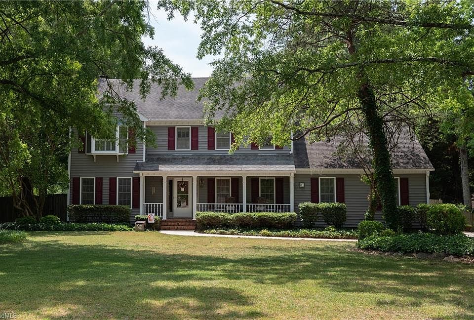 Lovely classic home with many recent updates ~ paint, water heater and HVAC updates. New roof in 2014, new siding, skylight and more. Large homeowner suite with dressing area and walk-in closet. Formal living room and dining room plus den and breakfast area. Tile floors in baths. Bonus room over garage. Large back deck overlooking shady, landscaped and fenced back yard. Rocking chair front porch. Wood burning fireplace with gas logs ~ can be converted back. Wired storage building plus workshop off oversized two car garage. Hardwoods, gas stove, and so much more!