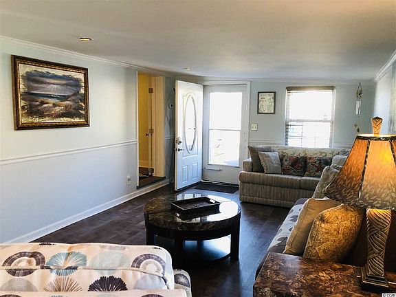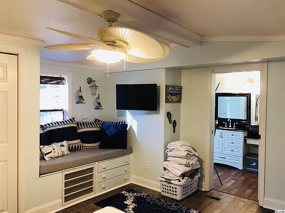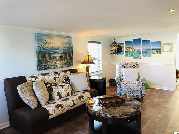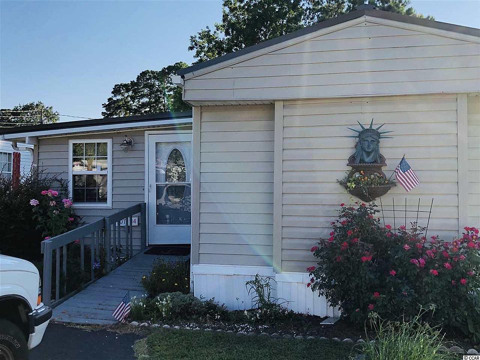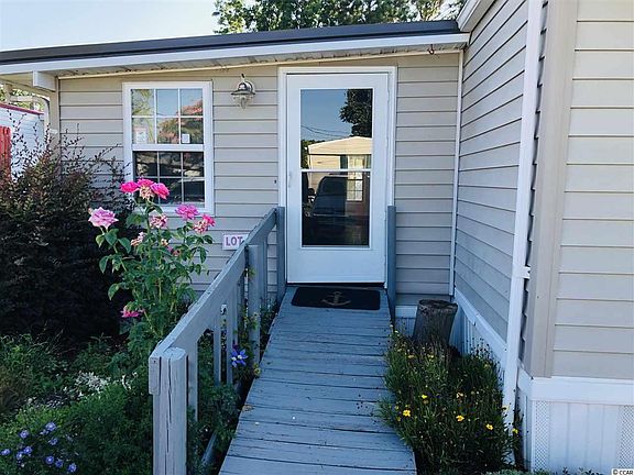 Cute reconditioned single wide and just a golf cart ride to the beach. Very clean and newly remodeled in 2019 this home has newer heating and air system,electrical wiring, plumbing, energy saving storm doors & windows and metal roof. Spacious light and airy living area has new drywall, luxury vinyl plank flooring throughout and fresh paint. Private master suite has remodeled bathroom with granite vanity tops, walk in shower and jetted jacuzzi tub. Well designed kitchen has new cabinets, countertops, sink, stainless steel Bosch dishwasher, side by side refrigerator,range and microwave. A Split bedroom floor plan gives everyone privacy. There's a full bath, bedroom, office and sunroom with private access to a tropical landscaped back yard. There's even an outside workshop/storage for extra storage space. So close to MB International Airport, Coastal Grand Mall, Broadway @ The Beach and the shores of Myrtle Beach, SC! Lot is on leased land. New owners must be approved by park manager prior to sale.