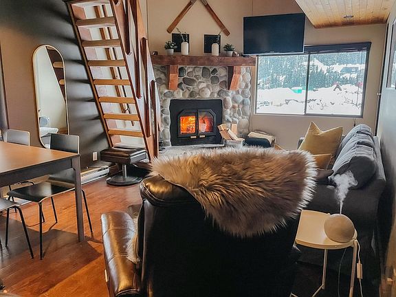 One of the best locations at 21000 Enzian! This end-unit ski-in, ski-out condo w/1 bed + loft & 1 bath has something for everyone! Situated on the south end of building 'B' w/views of the resort and overlooking the pool, you couldn't ask for a more private location. Being on the 1st floor, you can walk straight from your oversized underground parking stall right to your front door; NO STAIRS!!! Shared laundry on the same level, and one level below is the pool, hot tub, sauna, adults lounge, kids' games room and storage locker. The unit itself has serious Hygge vibes, finished w/cedar trim, fir doors, river rock wood fireplace, chunky fir mantle and natural tones throughout that will have you snug as a bug!!! Selling fully furnished so you'll be ready to own or rent in the 2022/23 season!!!