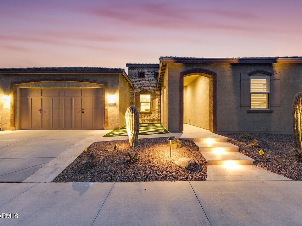 $80k+ in upgrades. Welcome to the award-winning active adult Community of Province! Elegance meets comfort in this exquisite home, boasting a popular Redding ranch floor plan with a top front elevation. Nestled on a unique premier lot, it offers water views in both the front and back, providing unparalleled serenity & tranquility. You'll LOVE the desirable open layout paired with 10 ft ceilings, automated shades, modern 5'' floorboards, wood plank tile throughout, shaker-style doors, and matching chandeliers & pendant lighting in all the right places! The gourmet kitchen includes an RO drinking water system, high-end SS appliances, quartz counters, stylish tile backsplash, slow-close cabinetry, and a prep island with a breakfast bar. Norman wood shutters in all well-appointed bedrooms The main bedroom has a bay window, a French door to the back patio, and an ensuite with dual sinks, a walk-in closet, & a Japanese toilet bidet. PLUS! This gem comes with a water softener and 3-zone heating & cooling. Convenience is key with a 4-foot garage extension boasting poly-coated flooring and storage racking. Discover the open backyard with a full sunset view, modern hugger ceiling fans, and built in speakers on the covered patio! The landscaping complete with more than 1,000 sq ft of travertine tile and turf, meticulously crafted by KT Hardscapes, features majestic Seguro Cacti with a 20' signature pine tree creating a picturesque oasis that sets the tone for the beauty within. It is also enhanced with professional landscape lighting and brand-new irrigation lines installed front & back to ensure optimal plant care. Enjoy the fantastic clubhouse amenities, including a pool, spa, concerts, workout facility, sports courts, and so much more. Start living a good life!
