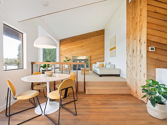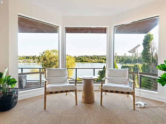 Your lakefront Mid Century Modern dream house has arrived just in time for summer! A modern addition brought mid century architecture to this waterfront gem that is a perfect blend of preserved vintage details + modern updates. Mesmerizing views of the lake and nature from the large south facing bay windows in the living and dining rooms.The living room also features vaulted ceilings, a natural wood clad wall that mimics the exterior siding bringing the outdoors in and a gas fireplace.The open floor plan connects the kitchen, dining, and living spaces making it comfortable for everyday living and entertaining. A sliding glass door off of the dining room opens to a large deck overlooking the lake, the perfect perch for relaxing by the water. The kitchen features new slate flooring, modern stainless appliances, quartz counters with bar seating. Three ensuite bedrooms, one on the main level and the large primary on the daylight lower level featuring beautiful vintage tile, polished concrete floors, wood ceiling and a wall of windows & lake views. The lower level has high ceilings, polished concrete throughout, a flex bonus room for storage or office, laundry area, wood slat ceiling in the secondary living room with more views and access to the aggregate patio + lower level deck.The beautiful setting features a landscaped yard with established plantings that leads to your own private dock on Fairview Lake with a view of Mt Hood from the lush backyard lawn. The entry, with a design reminiscent of the Northwest Regional Style, has natural stone details and a beautifully preserved wood door open to the newly finished hardwood floors that flow through the entry, dining space and main level bedroom. Located close to the Columbia River,Gorge activities,Troutdale dining/shops,Edgefield. This is the home we have all been dreaming of where you can bask in the beauty of waterfront nature + midcentury architecture in the same space.