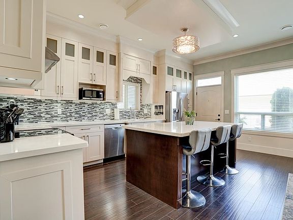 Luxury and comfort meet in this stunning 5 bed, 5 bath Yorkson home. Quality craftsmanship shines with 10’ ceilings, coffered details, rich millwork, and a bright open layout. The chef’s kitchen features white shaker cabinetry, a massive quartz island, and seamless flow into a spacious living room—perfect for entertaining. Upstairs offers 3 bedrooms, each with a spa-like ensuite; the primary includes a 2-person jacuzzi tub. Bonus: 2 laundry areas and a 2-bed legal suite with a great tenant. Enjoy A/C, pro landscaping, mature trees for privacy, and a two car garage plus 2 extra parking spots. Ideally located in a quiet cul-de-sac in prime Willoughby—close to top schools, parks, shops, dining, Hwy 1, and the upcoming Smith Athletic Park just a block away.