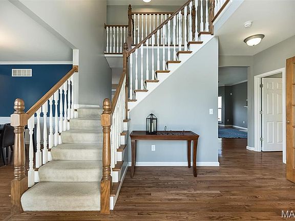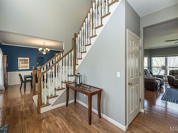 Welcome home to this beautiful 2 story home in Avalon Hills in AAA Rockwood School District! This home features 5 bedrooms, 3.5 baths, finished walk out lower level, updated kitchen & more! The dramatic 2-story entry foyer has hardwood floors and a T-staircase & is open to a den/home office w/french doors, along w/formal dining room w/crown molding. The large family room boasts bay window & gas log fireplace. The updated kitchen 42'' white cabs, cntr island, granite counters, stainless appliances, butler pantry w/storage drawers, breakfast rm w/bay door. Main floor laundry! Upstairs you will find 4 generous size bedrooms, including a primary bdrm suite w/coffered ceiling, luxury bath w/dual sinks and separate jacuzzi tub & shower. More living space is found in the walk out lower level providing a rec room, exercise area, 5th bdrm or office, full bath & storage. Enjoy backyard BBQ's from the composite deck w/attached awning & trampoline stays! New carpet too! Don't miss this one!