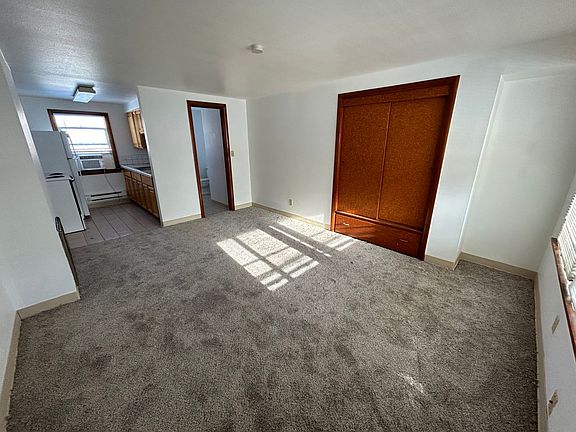 Tiled full-size kitchenCozy carpeted living spaceDouble-door closetWindow ac unitOpen-concept floor planAmple cabinet storageWood cabinetry