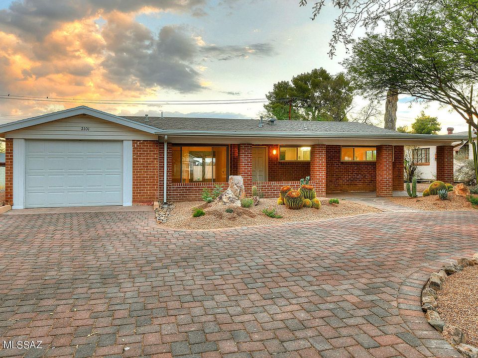 * Seller will accept or counter offers between $450,000 and $475,000. This lovingly restored 1951 wire-cut red brick home is conveniently located near the U of A, Banner Hospital, restaurants and shopping. The 1,543 sq. ft. ranch-style residence includes 3 bedrooms (the living room with a full bath could be 3rd bedroom), 2 bathrooms, and a 1-car garage/workshop. The home has been extensively remodeled or updated including a new paver driveway, a new roof, a new AC unit, new interior gas lines, all freshly painted throughout (exterior & interior), all new exterior doors, all new windows throughout, brand new ceramic tile flooring with marble thresholds, and new water supply from mains to house. The tastefully remodeled kitchen provides Silestone countertops, all new cabinets,