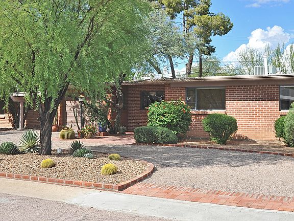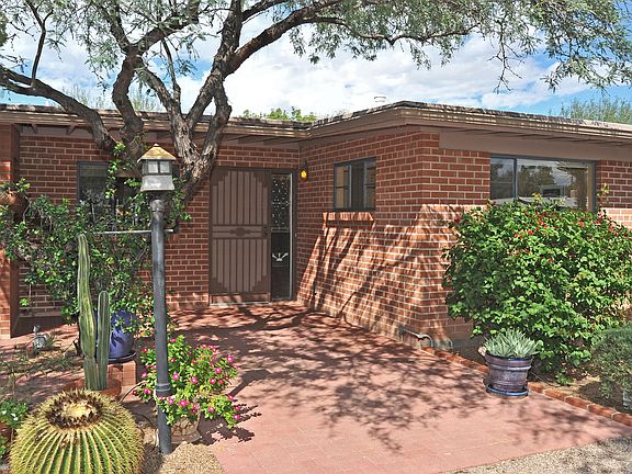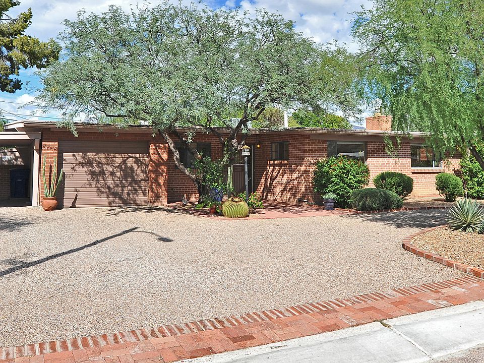 Mid-century gorgeous in desirable Shaheen Estates! This well maintained double brick home is ready for entertaining. The greatroom has 16'' tile, gas fireplace and surround sound. Kitchen has solid wood cabinets, all with slide-out shelves. New carpets in bedrooms. Master has double closets and a bonus seating area/office.Indoor/outdoor living starting with a covered porch. Built in BBQ with slate prep/serving countertop, stainless steel cabinet, drawers. Outdoor fireplace has seating for enjoying the cooler days to come. The backyard has passive water harvesting, Botanical Garden quality cactus and trees. Flagstone pathways meander for you to enjoy. Come take a look!