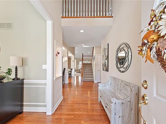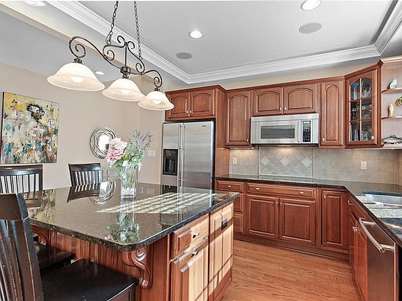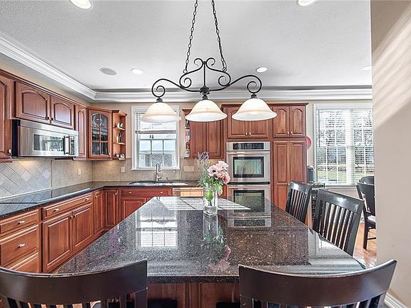 Serenity awaits you in this forever home with spectacular new patio paradise, maintenance-free living, and master-on-main. A distinguished two-story foyer welcomes guests. Warm hardwood floors flow into the formal dining room (currently being used as an office), through the kitchen area, powder room and into the laundry/mudroom. The chef's kitchen features granite counters, a center island and stainless Jenn Air appliances. With two-story ceiling and stone fireplace, the living room is perfect for gathering. A year-round sun-room walks out to Trex deck. The master suite holds a tray ceiling, walk-in closet, double-sink vanity, glass-enclosed shower, and jacuzzi tub. The upper level features a loft, two bedrooms and a bath. Finished lower level boasts a kitchen/bar, full bath, theater room, and family/game room. A workshop room and multipurpose/workout room finish the lower level. The patio outdoor kitchen includes built-in grill, pizza oven, outdoor fireplace and an Argentinian grill.