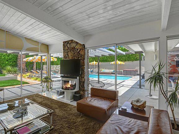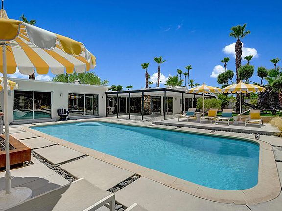 Welcome to ''The Retro Palm Springs'' - Tucked away on a quiet cul-de-sac in the heart of Racquet Club Estates, this one-of-a-kind Mid-Century Modern home has been meticulously reimagined with a bold nod to the design spirit of the late 60s and 70s. Walls of glass open seamlessly to a lush, private backyard oasis featuring a heated pool, detached spa, and plenty of space for relaxation or entertaining--perfect whether you're working from home or enjoying a Palm Springs retreat. Being offered Turnkey furnished, every detail of this 4 bed/3 bath has been thoughtfully curated over years of collecting and blending vintage character with modern convenience. Many wallpapers are rare new-old-stock from the 1970s, maintaining the retro aesthetic. Taken down to the studs, the home now offers today's best updates including a stylish new kitchen, remodeled pool, designer lighting and fixtures, and updated plumbing and electrical throughout. The detached casita is ideal for guests or entertaining, complete with a kitchenette and views of the mountains. The primary suite is a true retreat, opening to a gorgeous private outdoor shower and soaking tub. 2101 Berne has been featured in the publications Shelter and Atomic Ranch - it embodies the quintessential indoor-outdoor Palm Springs lifestyle the desert is known for.. With its electrifying design and undeniable charm, this home is not just a place to live, but a showpiece meant to be experienced.