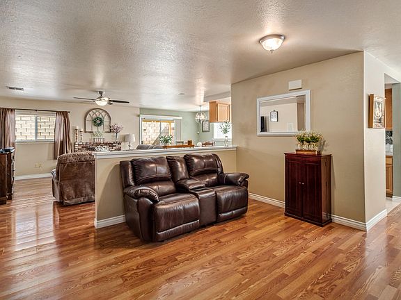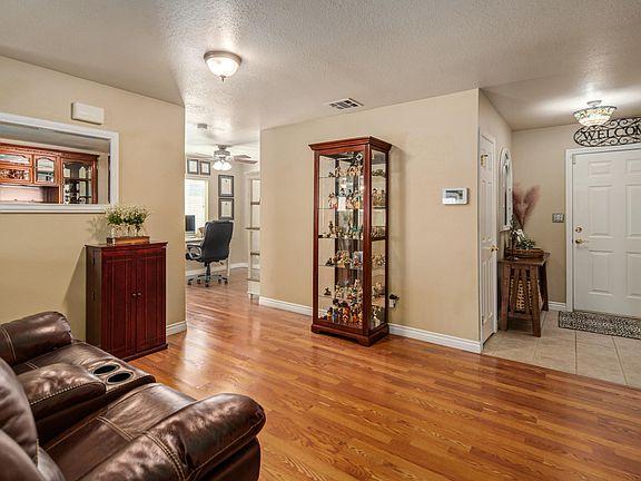 Welcome Home! This lovely single story home shows pride of ownership from the moment you step inside. Arriving to the home you see the wonderful curb appeal with the front porch area inviting you to take a moment and enjoy. Step inside and you will appreciate the open floor plan with large living area, den, kitchen, dining room and office area (or use it as a breakfast nook). The spacious living room boasts an inviting fireplace, ceiling fan and surround sound that is ready for connection to your entertainment system. Just off the living room is the kitchen with upgraded counters and newer appliances. Past the kitchen is the office area and indoor laundry room. Down the West hall are the 4 good sized bedrooms and two bathrooms. The primary bedroom hosts an en-suite bathroom with a luxurious oversized walk in shower to love. Back down the hall past the dining area is the sliding door to the backyard. Block walls surround the yard while a covered patio brings you the shade to enjoy the summer nights. Rounding out this home is laminate flooring in the main living areas, tile roofing, 2-car garage, Vivant Alarm system with video doorbell, Thermostat and cameras. Don't wait to schedule your private showing today.