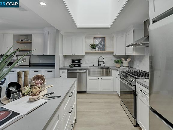 New! Stunning Sequoia remodel with a gorgeous view of Mt Diablo. Completely remodeled throughout, top floor location. Expanded kitchen with more than twice the standard amount of storage and cabinet space. New cabinets, quartz counters, marble backsplash, farmhouse sink, and stainless appliances (including gas range). Two large skylights create a light bright environment all day long. New Dual pane windows, LVP flooring, recessed LED lighting throughout. Custom designed bathroom with tiled, spa like shower. Stacked Bosch washer/dryer in unit. All new doors, craftsman style moldings, and finishes. Open deck with beautiful views of Mt Diablo and the Rossmoor valley. Excellent location, close to The Gateway Clubhouse and the Hillside Clubhouse. Carport is structure 405, space #3.