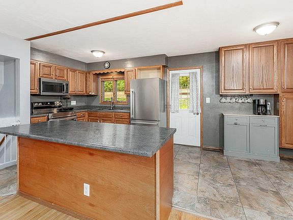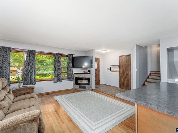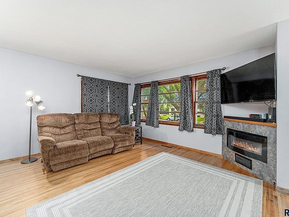 This charming home in Riverdale has it all inside and out. Here you'll find the kind of curb appeal you only get in Central Sioux Falls, surrounded by shade trees, large lots, and unique homes. Inside is a classic multi-level floor plan you just don't see in homes built today, with three bedrooms on one level, two living rooms above ground level, and a formal dining room. The kitchen, while open to the living and dining rooms, doesn't lose any storage. The stainless steel appliances complement the real wood cabinets, creating a stylish and functional space for cooking and entertaining. Large windows flood the home with natural light, highlighting the warm hardwood floors, and don't miss the modern electric fireplace living room, providing both warmth and ambiance. A second living room, also on the main floor, walks out to backyard, where a trampoline and a playset can stay with the home. Fresh paint in 2023, shed stays. Ask about assumable VA loan under 4%.