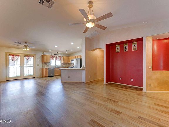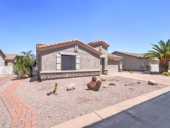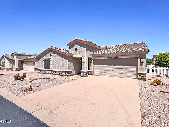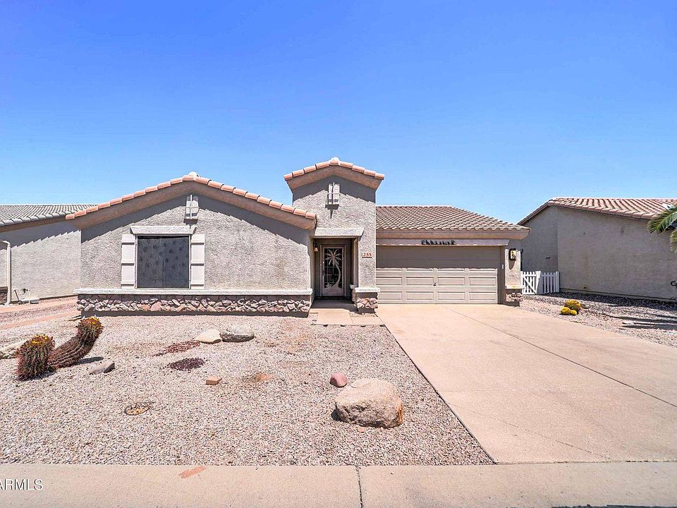 PLEASE INQUIRE ABOUT POSSIBLE PRICE REDUCTION! You will love this upgraded floor plan with split bedrooms and almost 1500 square feet! Tile floors, upgraded kitchen, custom paint and much more. The back yard faces North and has a great covered patio. Come see what has made Meridian Manor the choice in the East Valley for 55 plus living! Great clubhouse with library, fitness center, 6 billiard tables, craft room and Ballroom. Pickleball, shuffleboard and heated pool and Jacuzzi with a spectacular view of the Superstition Mountains! You'll love it here!