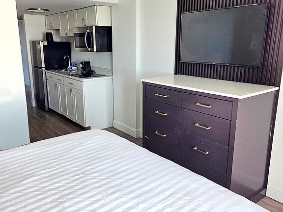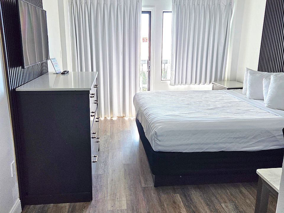 The Oceanfront Corner Suite, our most popular room, is laid out with 3 semi-private rooms. This spacious floor plan feels more like a two-bedroom apartment with a living space that can also be converted into a bedroom with the sleeper sofa. The first room: a full-size bed with a closet and a flat screen tv. The second room: a sleeper sofa, closet and flat screen tv. The third room: a king-size bed, desk with chair, flat screen tv, and a beautiful view of the ocean from the balcony.