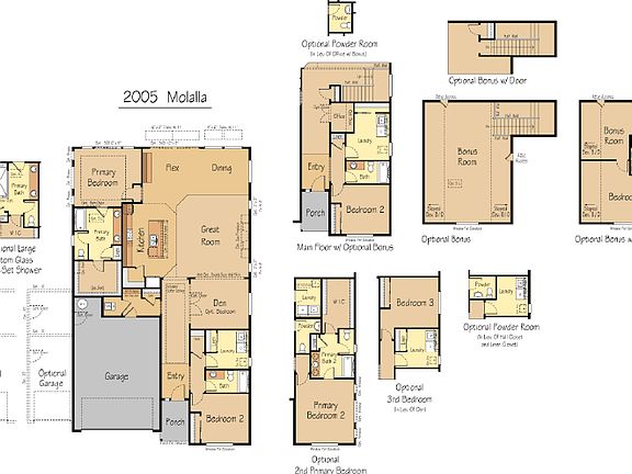 For relaxed and comfortable living, look no further than the Molalla. This brand new home plan is beautifully designed and appointed, with 2 to 4 bedrooms, up to 3.5 baths, and starting at 2,005 square feet. The home is available as a single-story family home for easy and casual living, or with multiple two-story options to expand and customize your living space as you see fit. The Molalla is the definition of space flexibility with numerous structural options from which to choose. The plan is designed to meet your unique lifestyle needs and can adapt to most life stages and preferences.Choose from 5 exterior styles, each meticulously designed with distinguishing architectural detail that enhances curb appeal and streetscape. Pull into a roomy two-car garage with a three-car option per homesite. An optional drop zone with coat closet at the owner's entry to stow personal items and prevent clutter in the home's main living areas. The home's primary entryway opens to a spacious secondary bedroom and full bath. Down a short interior hallway sits a storage closet and dedicated laundry room. Returning to the main gallery hallway, a cozy den can be optioned for a bedroom or second primary bedroom with an ensuite bath.