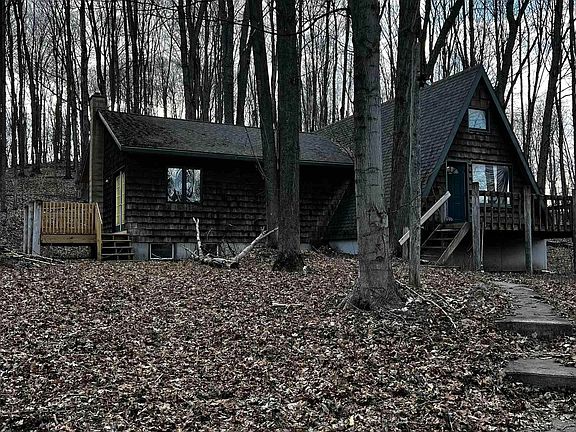 Escape to your private Up North retreat! Nestled on 10 peaceful acres, this charming 2-bedroom A-frame chalet offers the perfect blend of rustic character and modern comfort. Surrounded by towering trees and wildlife, the home features soaring vaulted ceilings, 2 beautiful decks that provide peaceful outdoor comfort. The open-concept living and kitchen area is charming and inviting. Whether you're looking for a year-round residence, or weekend getaway, this property is a true four-season haven. Explore the land, hike your own trails, or simply unwind in the serenity of nature—all just a short drive from town amenities and recreational hotspots. Your A-frame adventure begins here!