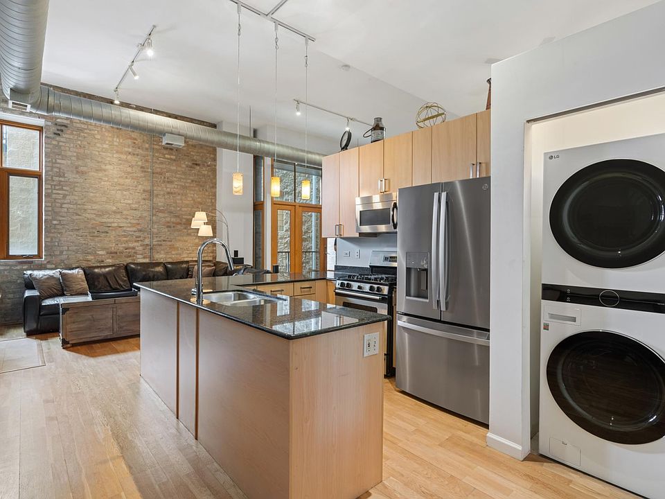 1 bed 1.5 bath 1200 sqft Loft with new refrigerator, new dishwasher, new app accessible laundry, new app accessible thermostat, double sinks, Jacuzzi bathtub, covered patio, fireplace, granite counters, overhead storage, walk in closet, 65" tv, 40" tv, Cable, internet and covered parking all included in rent. Community rooftop deck with incredible city views also included