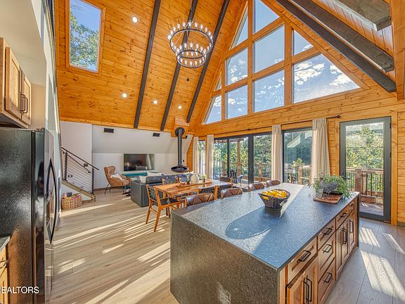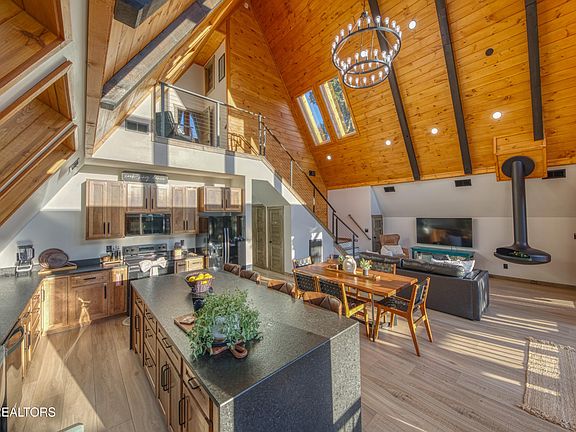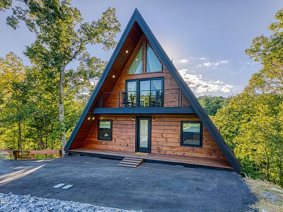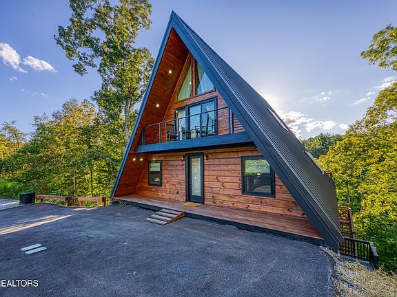 STUNNING! Custom Built A-FRAME Cabin PROJECTED INCOME UP TO $92,500 per year & nestled in the Great Smoky Mountains area of Sevierville with it's amazing sunset and sunrise views through wooded scenery are sure to impress! As you step inside you will be greeted by Modern & Rustic interior designs throughout, large skylight windows on each side, floor to ceiling windows & large sliding glass doors. The cabin features 3 en-suite bedrooms with bathrooms. The large windows will bring you & your guests closer to nature, a large luxury hanging trumpet shaped fireplace, a spacious open floor plan and a large black iron chandelier really set the mood for a perfect space for you to relax or entertain. From the 2nd floors main bedroom you can soak in your jacuzzi tub as you take in the sunrise every morning and soak away in the evenings on the rear decks sunken hot tub as you relax to the most amazing sunsets! Comes equipped with a golf putting game, corn hole, board games, a lounging area lower-level rear deck also the resorts pool and picnic/grilling area are only 1 min walk from your front door. It's stylish design, decor, elegant furnishings, comes fully equipped for it's start into the areas excellent STR market & it's location being a short drive to major attractions like Dollywood, Soaky Water Park, Sevierville Golf Club, Sevierville Convention Center, Target, Publix, Gatlinburg, Pigeon Forge, The Great Smoky Mountains, and Douglas Lake are perfect for year-round escapes and are sure to make this cabin a rental income success!