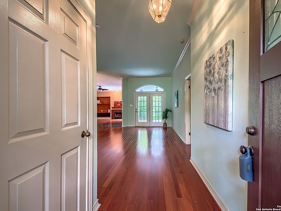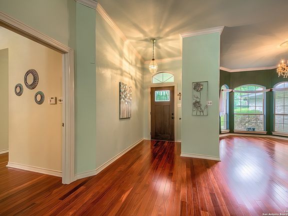 OPEN HOUSE SATURDAY 10am-1pm!!! ELEGANT GARDEN RIDGE ESTATE AWES WITH A CLASSIC PRESENCE! This single story, four sides brick rancher with four bedrooms and a swimming pool sits on 3/4ths of an acre shaded by live oaks and elms on a greenbelt. Wind through the quiet neighborhood past resting white tail deer to this graceful beauty with lush lawn and side entry three-car garage. Step through the front door and into a home that welcomes with high ceilings, gleaming traditional mahogany hardwood flooring and wonderful open floor plan. A formal dining space to the left opens to the formal living space with view through french doors of the private backyard space. Imagine the entertaining you can do in the elaborate family room with fireplace, gorgeous wood built-ins and cool wet bar with sink that runs the length of the wall! Chefs can be part of the action from the kitchen with truly stunning space -- breakfast bar, amazing gas cooktop, two ovens, a handy butcher block island plus a recipe nook along with seeming miles of countertop. A separate pantry in addition to shelving in the oversized adjacent laundry will leave you with more storage than you hoped for. The long countertop in the laundry is also an excellent workspace. The primary suite is set privately off on the east wing of the home with view of pool and forest and with access to the patio. Gasp in pleasure at the renovated ensuite bath awash with natural light. Relax in your freestanding garden tub or enjoy the huge glassed in shower with custom tile and river rock floor. The separate vanities with gorgeous granite and upgraded fixtures make the space feel like a resort at home! On the west end of the house, tucked behind the family room, find the three spacious secondary bedrooms two with charming window seat benches and one with a full ensuite bath with walk-in shower! The guest bath, accessible from the hall, is extra large, with two sinks and long counter with tub and shower combo. Plantation shutters throughout provide a refined touch while the crown molding adds a touch of class. You can enjoy the outdoors in all weather from a long covered porch that overlooks the swimming pool, adjoining spa and the rest of your acreage with the wooded greenbelt extending your privacy and view. Watch the deer craze and foxes scamper from behind a wrought iron fence. The three-car attached garage, accessible off the utility room, not only is large enough to house even SUVs but also offers natural light, wall to wall shelving, workspace and a water softener. All this in the coveted Garden Ridge (no HOA) with its excellent Comal County schools and city services. Tucked between San Antonio, Schertz, Bulverde and south New Braunfels, it feels like country but uber convenient -- being just 5 minutes from the grocery, I-35 and Loop 1604! Easy commute to downtown San Antonio or military bases. Imagine yourself in your forever home here.