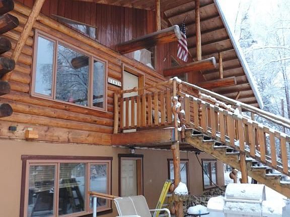 Super cute, cozy log home on poured concrete foundation. Cathederal ceilings, wood stove, new carpet/paint. Improved circular driveway, with lots of parking. 720 square foot garage, woodshed.