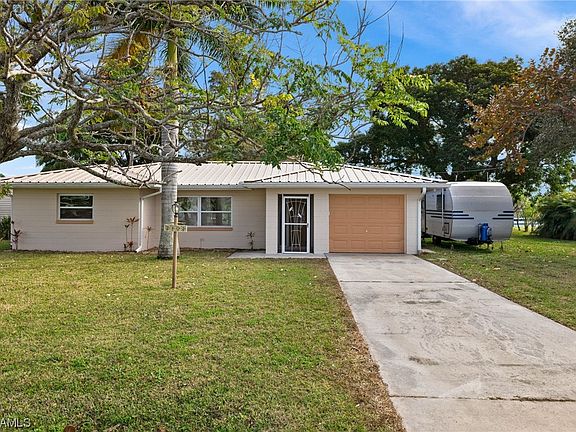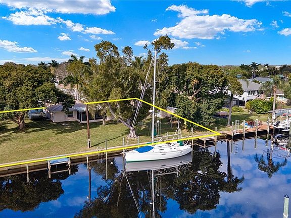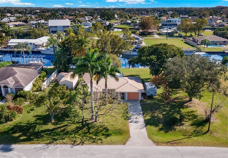 This renovated waterfront home in Ft. Myers Shores provides the perfect place for boating enthusiasts or those looking to enjoy the tranquility of waterfront living. This 2 BD/2 BA home sits on a double lot with 120' of water frontage on the wide and deep canal only minutes from the Caloosahatchee River. Screened in rear lanai is the perfect spot to relax enjoy the view complete with mature, picturesque trees. Water and electric are available near the 3 wooden docks. The home offers open concept living space and plenty of natural light providing a warm and welcoming space. The home has an indoor laundry area and a one car garage. Looking for extra storage or perhaps a workshop, then the 280 sq ft shed with elec offers a perfect solution. Practical features of this concrete home include a 2020 metal roof, updated windows, and a new HVAC. This location offers the perfect balance of tranquility and convenience. With easy access to I-75, you are close to all the entertainment options in downtown, shopping and of course Ft. Myers beaches. Whether you are looking for a permanent residence or a vacation getaway, this home offers the perfect blend of comfort, style and convenience.