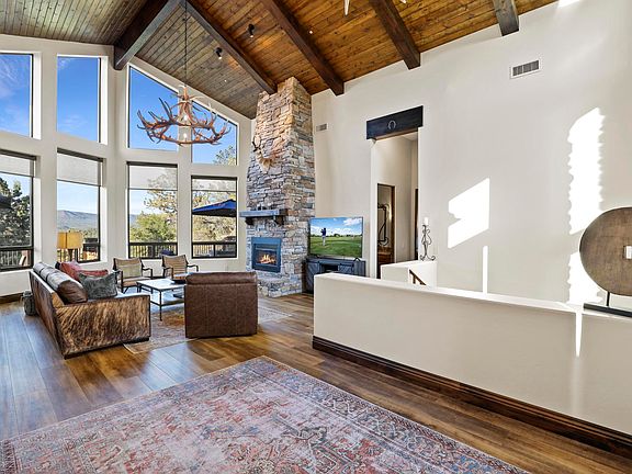 This magnificent 3520 sq ft home is the perfect mountain retreat. As you enter, you're met with a spectacular view of the Mogollon Rim & the 12th fairway made possible by the soaring ceilings & panoramic windows. The owner has spared no expense in updating & remodeling the home. The main floor contains a spacious great room with gorgeous stone fireplace that goes all the way to the tongue & groove ceiling. The kitchen has quartzite countertops, custom cabinets, island & high end appliances including double ovens, gas range & side-by-side fridge. The large master suite boasts beamed ceiling, tiled shower, deep soaking tub, double sinks, & best of all, access to the outside deck. The casita has the 4th bedroom & full bath with private balcony & kitchenette. All bedrooms have patio access. The lower level has another living area with a linear fireplace & media wall. It also has 2 more bedrooms and a full bath. Enjoy the views while relaxing in the hot tub on the patio. A step path to the golf course was added and pavers & steps on the sides of the home allow access to the entire perimeter. With all that this home has to offer, you couldn't ask for more.