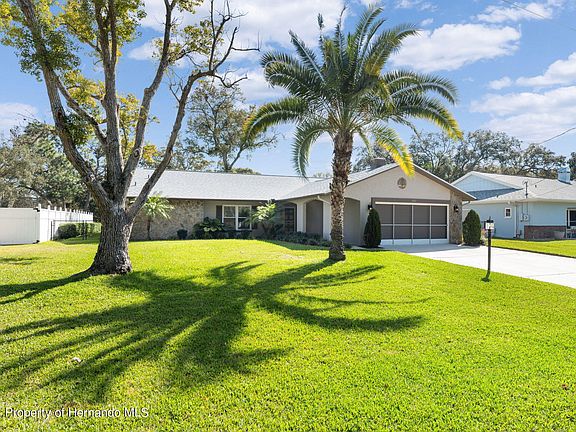 Active Under Contract - Accepting Back Up Offers. Love is in the air - swipe right on this irresistible Spring Hill home! No catfishing here: this beauty's curb appeal is off the charts with brilliant landscaping, a paver-extended driveway, and a screened 2-car garage. It's been meticulously updated with a new AC in 2020, a new roof in 2021, and a brand-new water heater in 2024. Inside, the layout is timeless and functional, with flexible living areas centered around the kitchen. Wider door frames and entryways to accommodate wheelchairs makes it accessible, too. Newer vinyl flooring, chair railing, and a digital programmable thermostat add modern touches to the interior. The upgraded kitchen features freshly painted cabinets, stone-inspired and refinished counters, and the most charming breakfast bar, where you can nibble on a snack or sip coffee in the mornings. The primary bedroom is a private retreat thanks to the split-bedroom floor plan; it's spacious and bright with its own access to the Florida room. The ensuite primary bathroom has a large walk-in shower with a grab bar and an amazing jetted shower system. It's connected to a compressor in the closet that has the potential to turn the entire bathroom into a literal sauna! Both bathrooms feature newer vanities and mirrors, too. Each guest bedroom is sizable with plenty of closet space for the comfort of your family or visitors. Dazzling sunlight streams through the large windows in the enclosed Florida room. Throw open the windows to let in the fresh air on temperate days, but don't worry about it getting stuffy on hot or cold ones - this room is technically on central heat/air. From here, you'll have a lovely view of the big, beautiful backyard. It's fully fenced with a modest paved patio (perfect for your grill or smoker) and a shed for additional storage. You can even catch a glimpse of the retention pond out back from the left corner of the yard. Ideally situated in a neighborhood with no HOA fees or restrictions, it's not far from an entrance to the Suncoast Parkway for easy access to Tampa. US-19 is close for a convenient drive to Homosassa, Tarpon Springs, or Clearwater. Within a 5-mile radius, you'll find the Spring Hill Branch public library, the Hernando County YMCA, the Nature Coast Botanical Garden, and not one, but TWO public parks - Veterans Memorial, and Delta Woods Park. There's plenty of shopping and dining options minutes away, as well as schools and hospitals. Discover the magic of real mermaids and the natural beauty of Florida's Adventure Coast at nearby Weeki Wachee Springs State Park. Call us today and let us play matchmaker; this is one first date you don't want to miss!