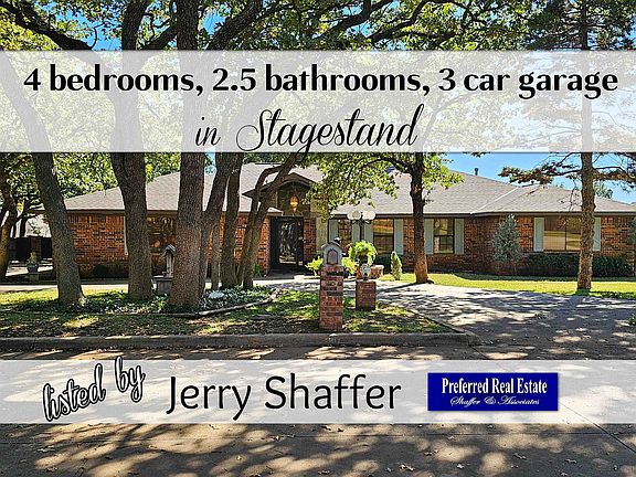 This is a 4 bedroom home with 2.5 bathrooms in the Stagestand Addition in Duncan. Stagestand is well loved for its trees and the layout of the neighborhood which makes it great for running/walking. This property offers a delightful outdoor setting, with a large covered patio, and a 12 x 16 finished out storage/workshop with brick veneer. The circle drive, extended driveway, and oversized 3 car garage provides an abundance of parking. The extra spacious living room can host large gatherings and has plenty of space for large furniture, including a formal dining setting or game/pool table. It has two patio doors to enjoy the shaded backyard, vaulted ceiling and raised panel accent and trim work. A double sided fireplace services both the living room and the master bedroom. For more details of this homes potential call the listing agent, Jerry Shaffer 580-251-0688. Preferred Real Estate in Duncan.