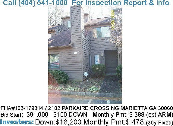 105-179314 Great East Cobb condo buy and just listed ($100 down payment) with just days left to bid in FHA auction. Call to pre-qualify to see and bid in the next few days before this home is sold in auction. Lots of home for the area and low purchase price! This home will receive multiple offers so be the smartest bidder and use a certified HUDREGOV Specialist! <br><br>Contact Zipity Duda today for availability and to see this large traditional 2 bedroom 2 bath light filled home built in 1981 located in Parkaire Crossing. HOA $230/month. Repairs of $3795 (pick your carpet) can be financed with FHA loan. Closing costs up to 3% paid by HUD! Great FHA owned home for sale in Marietta GA, in Cobb County Georgia 30068. NEW LISTINGS ADDED DAILY! Home buyer tax credit expires April 30 must close by June 30, 2010!<br><br>Hurry, $100 down payment, $1,000 earnest money can move you into your dream home! (LISTING AGENT ON SIGN REPRESENTS SELLER.) Please contact me to represent your interest with bidding on this property or another home purchase.<br/><br/>Brokered And Advertised By: Maximum One Realty Greater Atlanta<br/>Listing Agent: Richard Duda