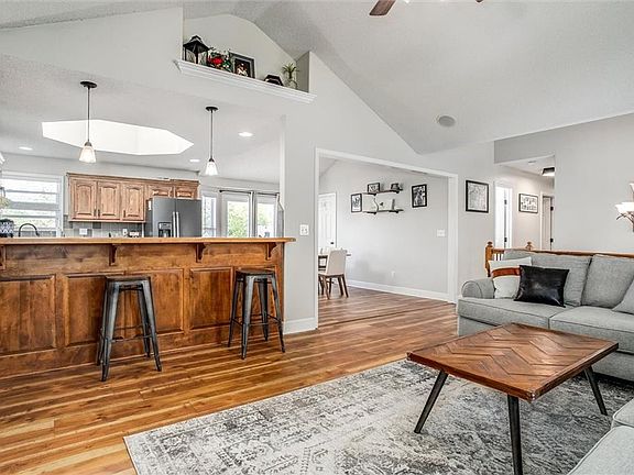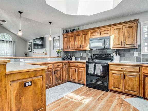 Impeccably Maintained & Full of Charm! Step into this beautifully maintained home featuring light, neutral tones complemented by rich wood accents throughout. The inviting great room showcases gleaming hardwood floors, a cozy fireplace with an updated wood mantle, and built-in accent shelving. The kitchen offers abundant counter space, warm stained cabinetry, a corner sink with dual windows, and a pantry—ideal for everyday living and entertaining. Adjacent to the kitchen, the dining area impresses with soaring cathedral ceilings and a newer patio door that opens to a spacious, elevated deck—perfect for morning coffee or evening gatherings. Enjoy peace of mind with several newer thermal windows throughout the home. The spacious primary suite is a true retreat, highlighted by a stylish shiplap accent wall, trey ceiling with fan, walk-in closet, and a sliding barn door leading to the en-suite bath. The bath features a relaxing corner tub and separate shower. Two additional main-level bedrooms and a laundry closet add to the home’s convenience. The finished walk-out lower level includes a large family room with a mix of carpet and tile, a wet bar for entertaining, and a dedicated home office space—ideal for remote work or creative pursuits. Sitting on a generous, fenced-in lot in a highly convenient location, this home has it all. Don’t miss the opportunity to make it yours!