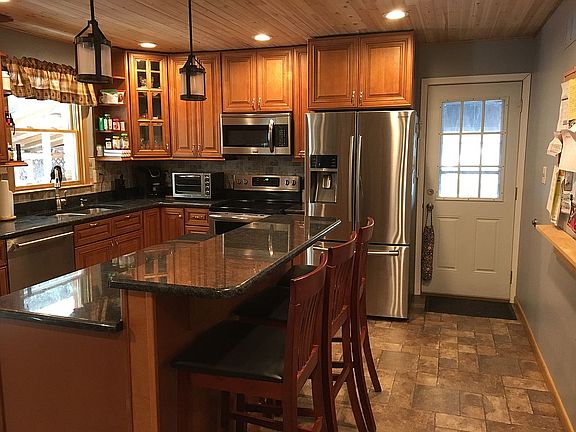 Totally renovated home with most windows updated, both bathrooms re-modeled and kitchen with solid wood cabinets with soft-close doors and plenty of storage with huge pantry and large cabinets and island. Stainless steel applicances include range, refrigerator, microwave and dishwasher. Custom granite countertops and tile backsplash along with eat-in island and custom ceiling and light treatments. Basement includes home theatre and solid wood tongue and groove paneling throughout with seperate laundry room and play area with desk. Additional storage room and additonal fireplace can be re-finished to suit. Storage above garage has been also been added along with professionally installed radon system. Wood burning stove upstairs and pellet stove downstairs completment the oil-fired forced air heat system. House has wireless internet throughout and underground dog fence installed. Over $70000 of improvements have been done to this home. Separate vacant lot next door included with home.
