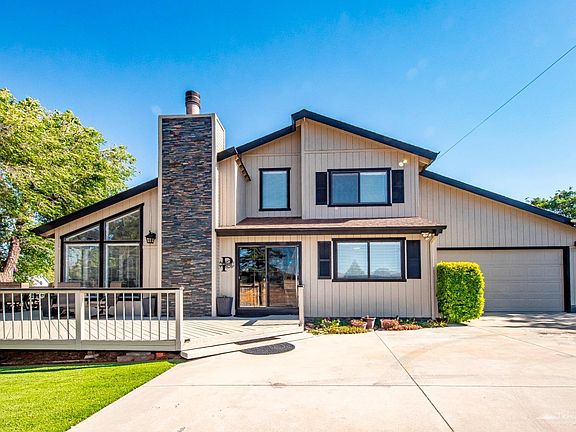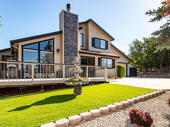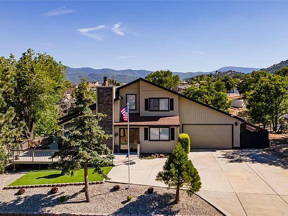 Tranquility begins at the front door of this 2,537 sq. ft. 3 bd. + 2ba. with an oversized bonus room and pool home! Welcome your guests through the inviting enclosed front porch/mud room that leads to the front door. Once entering the home, take note of the open floor plan, vaulted wood beam ceiling & beautiful picturesque windows that offer incredible views of the surrounding foothills & plenty of natural sunlight. Tasteful colors of neutral interior paint, custom baseboards, wood plank flooring & ceiling fans throughout. The living room has a fireplace that showcases a brick hearth & custom oak mantle. A gourmet kitchen with granite countertops, multiple cabinets, custom tile backsplash, and stainless steel appliances that include a double oven, trash compactor & refrigerator. Your chef's kitchen also has a single-basin farm-style sink, a garden window that looks into the stunning backyard, and a double island countertop for extra seating. The dining room is conveniently located next to the kitchen. The guest bathroom was remodeled with modern touches of sleek light fixtures, granite countertops & custom tile tub/shower enclosure. The laundry area is downstairs & includes a washer/dryer. All three bedrooms are spacious, with two bedrooms on the first floor & a private primary bedroom located upstairs. The primary bathroom is elegantly designed with granite countertops, dual sinks, dual walk-in closets, a custom stone & tile walk-in shower, and a jacuzzi tub & built-in electric fireplace. An additional permitted and oversized bonus room on the south side of the garage could be used for many options, such as a theatre room, game room, or an office. The stairway in the bonus room leads to a large, insulated storage room. Step out back to an entertainer's backyard! Features include a wrap-around deck, covered patio, mature & low maintenance landscaping with planter walls, DG & stone-style walkways, and a firepit on the lower level. Relax this summer season near your in-ground pool, which includes a Baja-style shelf. When star gazing at night or enjoying the views of the valley, come & see all of the beauty this home offers!